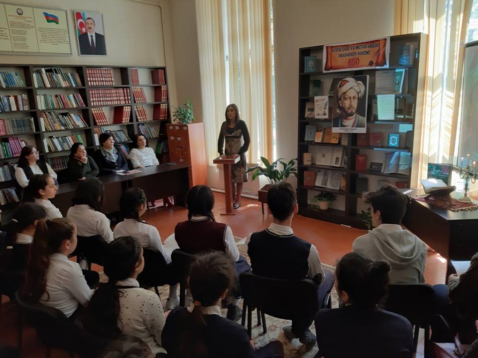 Sumqayıt şəhər Mərkəzi Uşaq Kitabxanasında dahi mütəfəkkir İmadəddin Nəsiminin anadan olmasının 650 illik yubileyi münasibətilə "Nəsiminin mənəvi irsi" adlı oxucu konfransı keçirilib. Azərbaycan Respublikasının Prezidenti İlham Əliyevin İmadəddin Nəsiminin 650 illik yubileyinin qeyd olunması və 2019-cu ilin Azərbaycanda “Nəsimi ili”nin elan edilməsi haqqında sərəncamlarına əsasən təşkil olunan yubiley tədbiri 12 və 16 nömrəli məktəbin şagirdlərinin iştirakı ilə keçirilib. Tədbir “Nəsiminin insana verdiyi dəyər”, “Nəsiminin sözə verdiyi dəyər”, “Nəsimi yaradıcılığında kamil insan obrazı”, “Nəsimi irsinə verilən qiymət, xatirəsinin əbədiləşdirilməsi”, “Nəsimi bədii ədəbiyyatda və incəsənətdə”, “İmadəddin Nəsimi yaradıcılığında tərbiyəvi ideyalar” mövzularında məruzələrlə davam edib. Daha sonra AYB-nin Sumqayıt bölməsinin sədri Gülnarə Cəmaləddinin, 12 nömrəli məktəbin Azərbaycan dili və ədəbiyyatı müəlliməsi İradə Quliyeva və 16 nömrəli məktəbin kitabxana müdiri Südakət Əliyevanın çıxışları dinlənilib.